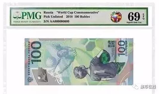 PMG(Paper Money Guaranty)為俄羅斯中央銀行發(fā)行的紀念2018 年國際足聯(lián)世界杯的100盧布紀念鈔推出特殊標簽。